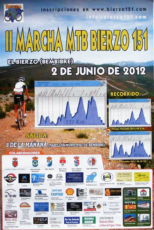 El próximo día 2 de julio de 2011, a las 8:00h., tendrá lugar la I Marcha Mountain Bike Bierzo 151, el recorrido de la marcha consta de 3 distancias a elegir: